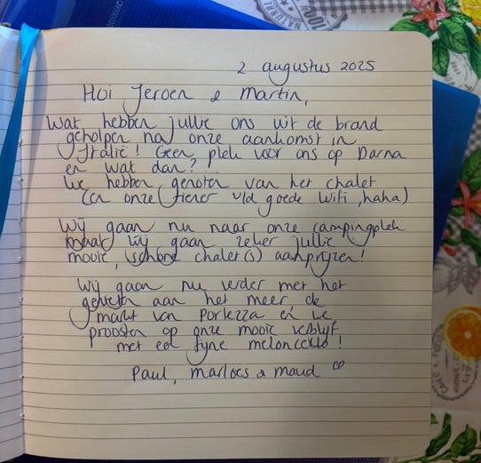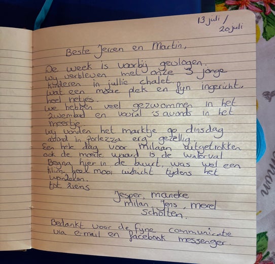 Voor de 2de keer waren we in jullie chalet, maar dit keer ook met 2 van de kids,we hadden ons zo veel voorgenomen om te gaan doen, maar eigenlijk waren de jongens gelijk al verkocht aan het zwembad en de glijbanen, ook op het meer hebben we uren vertoeft met de subboards. Savonds lekker een balletje trappen bij het voetbalkooitje, en daarna nog even vissen bij het meer. De chalet was keurig en netjes, we hebben er eigenlijk alleen geslapen en ontbeten. De watervallen bij Chiavenna waren super😍 en ook is de pizzeria op de Camping zeker een aanrader. Nogmaals, voor herhaling vatbaar. Veel liefs van ons